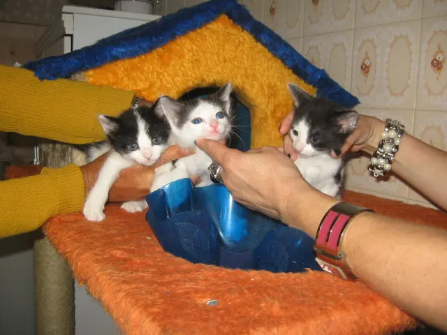 Estes gatinhos- 1 machinho e 2 fêmeas- estão com 45 dias e procuram um lar para morar. Já comem ração. São super carinhosos e sociáveis.