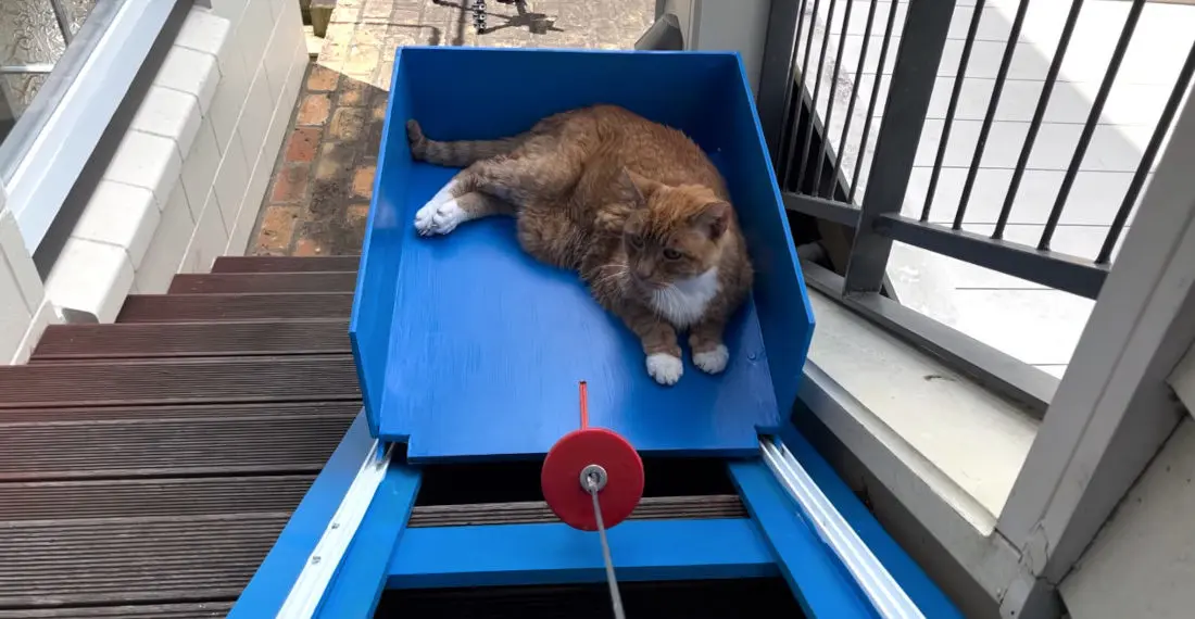 Liam é conhecido em seu país por criar vídeos de “faça você mesmo” e demorou quatro dias para construir um pequeno elevador na lateral da sua escada para que o pequeno Frodo possa tomar sol e brincar no quintal.