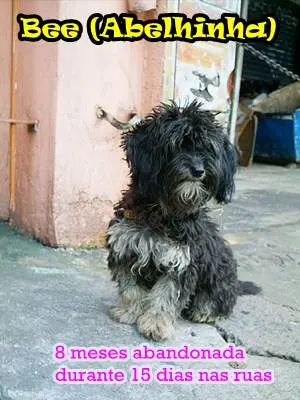 A Bee (Abelhinha) tem oito meses. Pesa uns 5 ou 6 quilos. Não insistam,ainda não está para adoção, pois não tenho condições de castrar todos estes animais urgentemente. A cachorrinha já tinha sido vista por conhecidos, mas foi pega pelo morador de rua que ficou com ela durante aproximadamente 2 semanas. Pensei muito se levava ou não levava, mas fiquei com pena, muito novinha, dentinhos branquinhos, sem castrar…