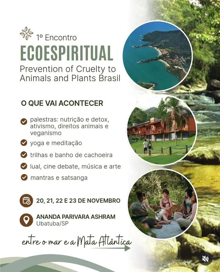 Entre os dias 20 e 23 de novembro, Ubatuba (SP) receberá o 1º Encontro Ecoespiritual organizado pela ONG Prevention of Cruelty to Animals and Plants (PCAP Brasil). A programação será realizada em meio ao cenário natural da Mata Atlântica e próximo ao mar, reunindo atividades que buscam integrar práticas de cuidado ambiental, espiritualidade e convivência comunitária.