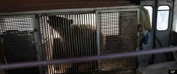 Ursa aposentada do circo de São Petersburgo está sendo mantida em jaula dentro de ônibus