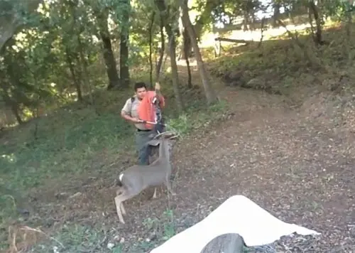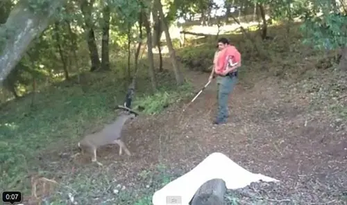 Um veado foi resgatado por um agente do órgão de controle de animais de Santa Cruz, no estado da Califórnia (EUA), após ser encontrado com o chifre enroscado em uma corda de balanço. O vídeo com o resgate do animal foi publicado pelo órgão no YouTube.
