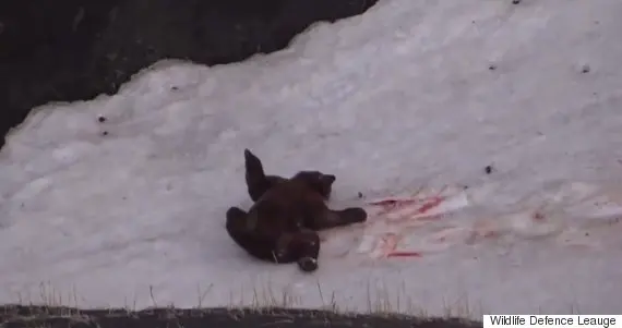 Ferido, ele pode ser visto lutando para escapar antes de escorregar pela neve, onde o sangue do animal que agonizava manchava a superfície.