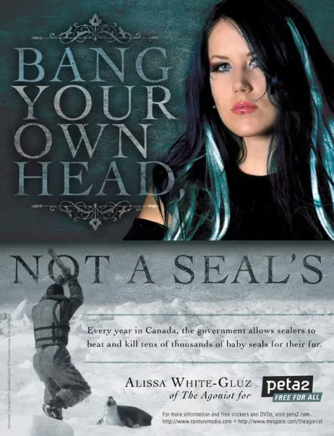 Alissa White-Gluz, vocalista da banda canadense THE AGONIST, considerada uma das mulheres mais “quentes” do Rock Mundial pela renomada revista Revolver, se juntou a lista dos artistas que lutam contra a indústria de peles. A bela cantora uniu forças ao PETA, uma das maiores organizações em defesa dos animais do Mundo, contra a anual caça às focas no Canadá. A campanha “Bang Your Own Head, Not a Seal’s” mostra White-Gluz acima de uma foto de uma foca bebê prestes a ser morta.